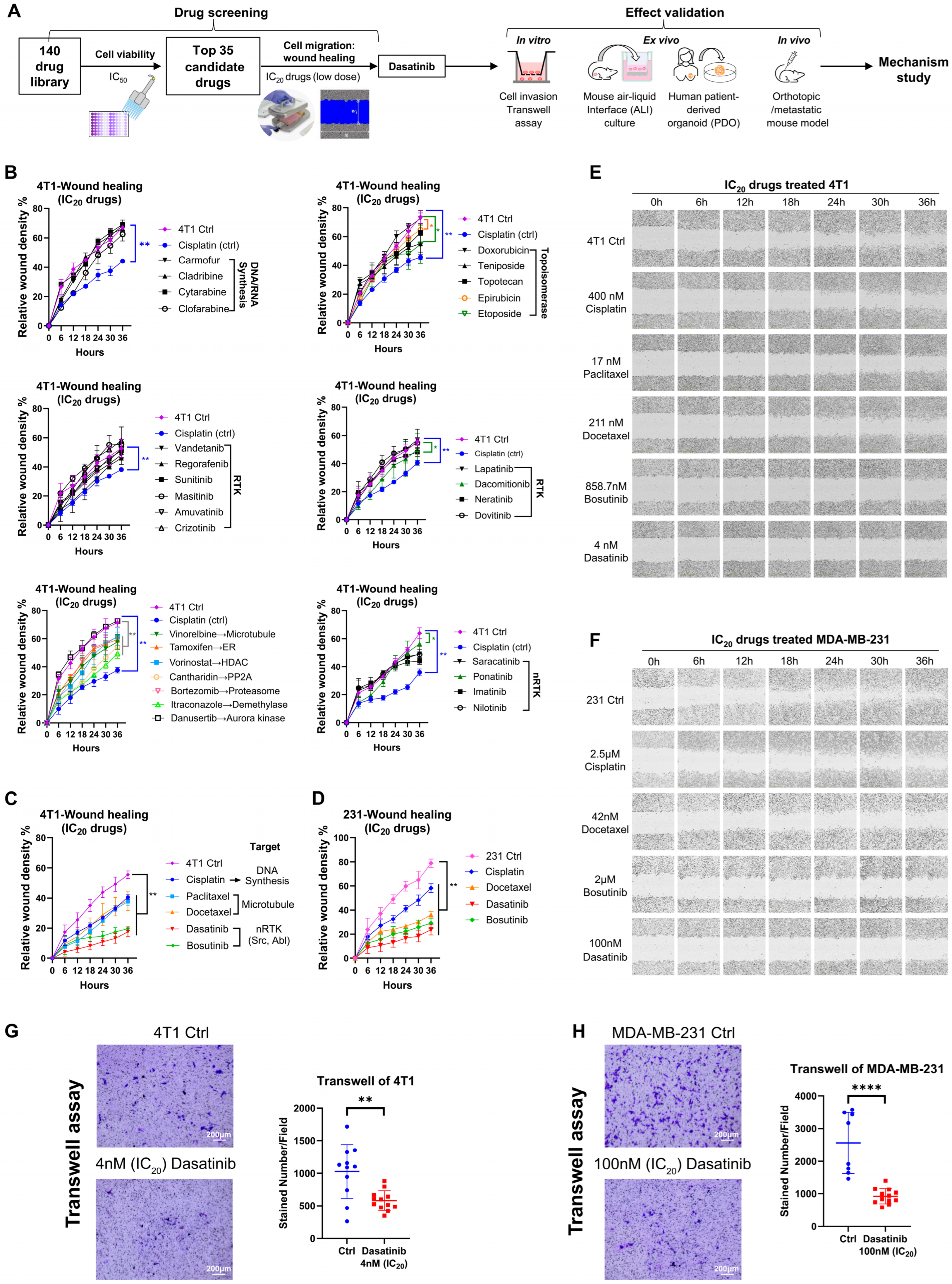 Figure 1. Screening of 140 drugs for inhibition of breast cancer cell migration. (A) Schematic overview of the drug screening workflow. (BD) Assessment of anti-migratory effects of the top 35 drugs. Wound-healing assays were performed at IC20 concentrations of the drugs, with images captured every 6 h over a 36 h period using the Incucyte live-cell imaging system. Migration was quantified by relative wound density. Error bars represent the mean ± SD from triplicate experiments. Abbreviations: RTK, receptor tyrosine kinase; ER, estrogen receptor; HDAC, histone deacetylase; PP2A, protein phosphatase 2. (E) Representative wound-healing images of 4T1 cells. (F) Representative wound-healing images of MDA-MB-231 cells. (G) Transwell invasion assay of 4T1 cells treated with dasatinib at the IC20 concentration. Representative images and quantification from triplicate experiments are shown. (H) Transwell invasion assay of MDA-MB-231 cells treated with dasatinib at the IC20 concentration. Representative images and quantification from triplicate experiments are shown. Statistical analysis was determined using a two-tailed t-test. * p < 0.05, ** p < 0.01, **** p < 0.0001.
