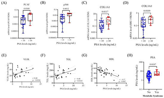 Gene expression and metabolic parameters according to PSA < 10 and ≥10 ng/mL. (A) Expression of PCAF in the PSA groups. (B) Expression of p300 in the PSA groups. (C) Expression of COL1A1 in the PSA groups. (D) Expression of COL3A1 in the PSA groups. (E) Correlation between serum VLDL and PSA levels. (F) Correlation between serum TGL and PSA levels. (G) Correlation between serum HDL and PSA levels. (H) PSA levels and MetS status. For group comparisons in the remaining panels, statistical significance was assessed using the Mann–Whitney test. A simple linear regression analysis was performed to evaluate the association between metabolic parameters and PSA levels. The p-values obtained from the statistical analyses are shown above the bars in each panel. The error bar corresponds to the standard deviation of the samples.