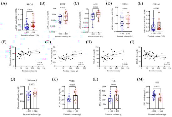 Gene expression and metabolic parameters according to prostatic volume (<100 or ≥100 mL). (A) Expression of SRC-1 in the prostate volume groups. (B) Expression of PCAF in the prostatic volume groups. (C) Expression of p300 in the prostatic volume groups (D). Expression of COL1A1 in the prostatic volume groups. (E) Expression of COL3A1 in prostatic volume groups. (F) Correlation between cholesterol levels and prostatic volume. (G) Correlation between VLDL levels and prostatic volume. (H) Correlation between TGL levels and prostatic volume. (I) Correlation between HDL levels and prostatic volume. (J) Cholesterol levels in prostatic volume groups. (K) VLDL levels in prostatic volume groups. (L) TGL levels in prostatic volume groups. (M) HDL levels in prostatic volume groups. US, ultrasound; g, gram. The Mann–Whitney test and unpaired t-test were applied depending on data distribution. A simple linear regression analysis was conducted to evaluate the association between metabolic parameters and prostatic volume. The p-values obtained from the statistical analyses are shown above the bars in each panel. The error bars represent the standard deviation of the samples.