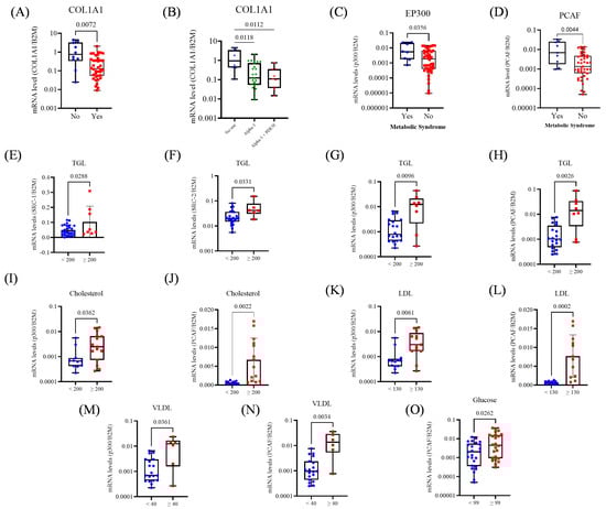 Expression of collagen genes and transcriptional coactivators in prostate tissue from BPH patients, according to pharmacologic treatment and metabolic alterations. (A) Comparison of COL1A1 expression between untreated patients and those receiving pharmacologic treatment for BPH. (B) COL1A1 expression according to treatment type: no therapy, alpha-1 blockers, alpha-1 blockers combined with PDE5 inhibitors. (C) Expression of PCAF and MetS status. (D) Expression of p300 and MetS status. (E) Expression of SRC-1 and TGL levels. (F) Expression of SRC-2 and TGL levels. (G) Expression of p300 and TGL levels. (H) Expression of PCAF and TGL levels. (I) Expression of p300 and Cholesterol levels. (J) Expression of PCAF and Cholesterol levels. (K) Expression of p300 and VLDL levels. (L) Expression of PCAF and LDL levels. (M) Expression of p300 and VLDL levels. (N) Expression of PCAF and VLDL levels. (O) Expression of PCAF and Glucose levels. The Mann–Whitney test, unpaired t-test, and Kruskal–Wallis (Dunn’s test correction) were applied depending on data distribution. The p-values obtained from the statistical analyses are shown above the bars in each panel. The error bar corresponds to the standard deviation of the samples.