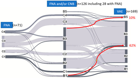 Sankey graph showing the changes in diagnoses during subsequent biopsies. FNA diagnoses to the left; CNB and FNA without subsequent CNB in the middle; VAE to the right; C1–C5 represent the cytological classification while B1–B5 the histological one. The red arrows show the most significant upgrade flows (from B1 to B3 lesions (62%) and from B3 to B5 (10%)). FNA, fine-needle aspiration; CNB, core-needle biopsy; VAE, vacuum-assisted excision.