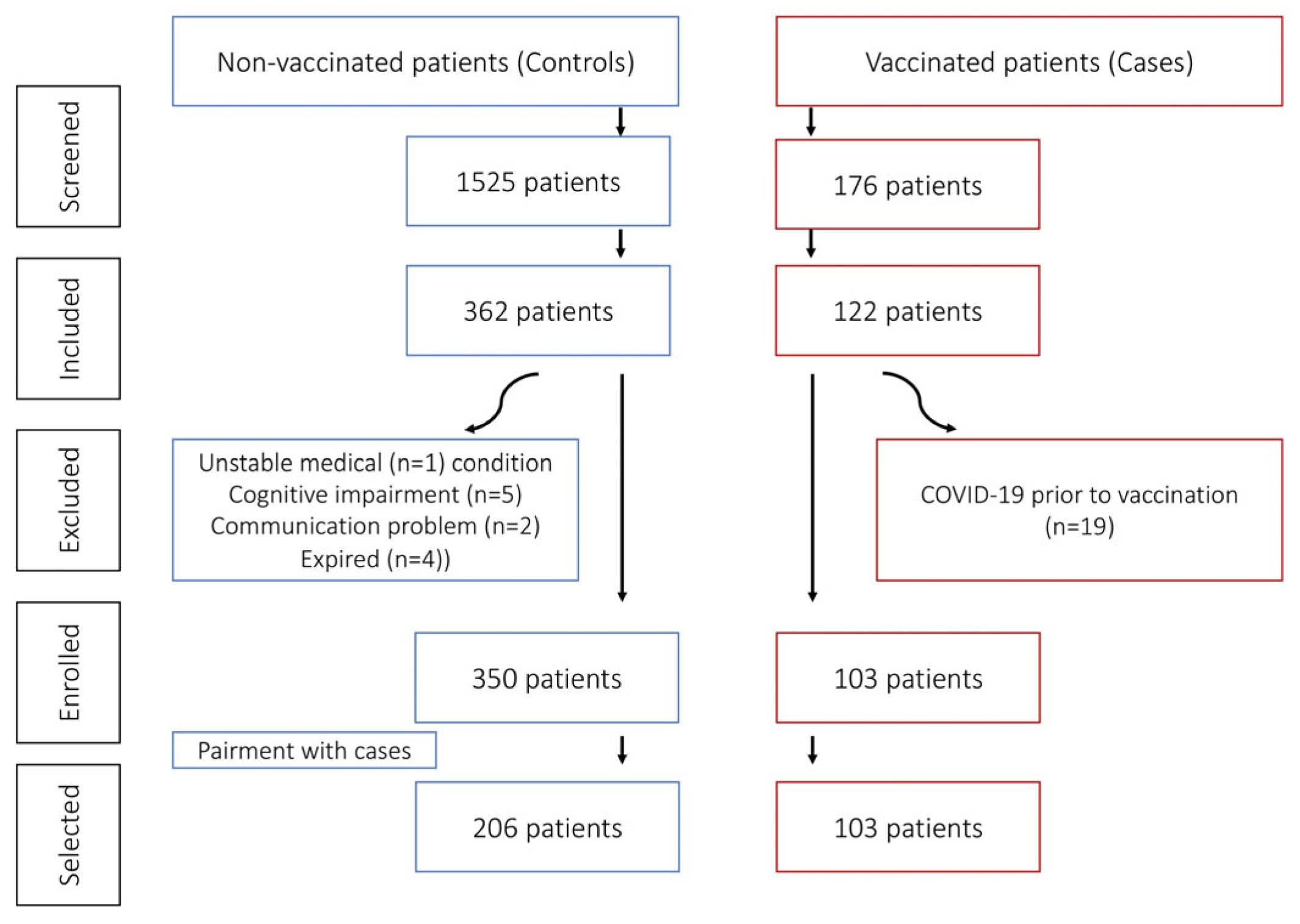 | Variable | Entire Study Sample (n = 309) | Vaccinated Patients (n = 103) | Non-Vaccinated Patients (n = 206) | FDR-Adjusted p-Value |