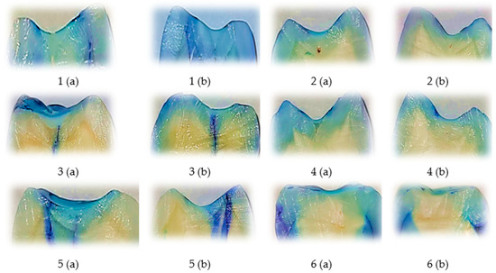 Representative longitudinally sectioned tooth samples treated with Fissurit FX (VOCO GmbH, Cuxhaven, Germany), showing dye penetration and microleakage patterns. Each tooth was sectioned into two halves, indicated as (a) and (b). Buccal (V) and oral (O) microleakage scores were recorded as follows: 1 (a): V = 1, O = 1; 1 (b): V = 0, O = 0; 2 (a): V = 0, O = 0; 2 (b): V = 0, O = 0; 3 (a): V = 3, O = 3; 3 (b): V = 3, O = 3; 4 (a): V = 1, O = 0; 4 (b): V = 1, O = 0; 5 (a): V = 3, O = 0; 5 (b): V = 2, O = 0; 6 (a): V = 0, O = 0; 6 (b): V = 0, O = 0. Scale bar = 1 mm.