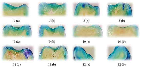 Representative longitudinally sectioned tooth samples treated with Perma Seal (Ultradent Products Inc., South Jordan, UT, USA) combined with an adhesive system, showing dye penetration and microleakage patterns. Each tooth was sectioned into two halves, indicated as (a) and (b). Buccal (B) and oral (O) microleakage scores were recorded as follows: 7 (a): B = 0, O = 0; 7 (b): B = 0, O = 0; 8 (a): B = 0, O = 0; 8 (b): B = 0, O = 0; 9 (a): B = 1, O = 0; 9 (b): B = 1, O = 1; 10 (a): B = 0, O = 0; 10 (b): B = 0, O = 0; 11 (a): B = 0, O = 2; 11 (b): B = 1, O = 0; 12 (a): B = 1, O = 0; 12 (b): B = 0, O = 0. Scale bar = 1 mm.