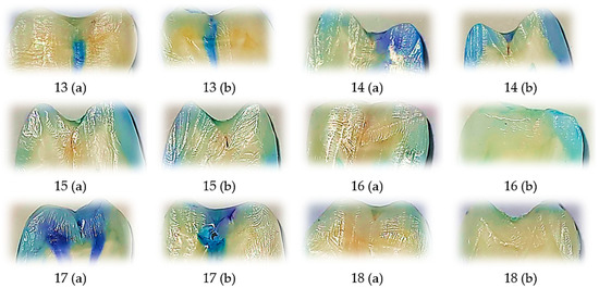 Representative longitudinally sectioned tooth samples treated with Perma Seal (Ultradent Products Inc., South Jordan, UT, USA) without an adhesive system, showing dye penetration and microleakage patterns. Each tooth was sectioned into two halves, indicated as (a) and (b). Buccal (B) and oral (O) microleakage scores were recorded as follows: 13 (a): B = 3, O = 3; 13 (b): B = 3, O = 3; 14 (a): B = 3, O = 3; 14 (b): B = 3, O = 3; 15 (a): B = 3, O = 0; 15 (b): B = 1, O = 0; 16 (a): B = 0, O = 0; 16 (b): B = 0, O = 0; 17 (a): B = 3, O = 3; 17 (b): B = 3, O = 3; 18 (a): B = 0, O = 0; 18 (b): B = 0, O = 0. Scale bar = 1 mm.