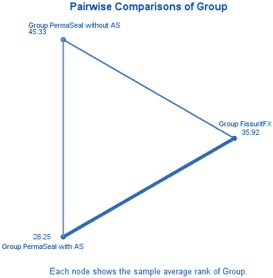 A triangular diagram (Figure 4) illustrates the pairwise average rank comparisons between the three experimental groups as calculated in the Kruskal–Wallis H test. Each vertex represents the mean rank of microleakage scores for a particular group. Group Perma Seal with Adhesive System (AS) had the lowest average rank (28.25), suggesting superior sealing ability and reduced microleakage. Group Fissurit FX followed with an intermediate average rank of 35.92, indicating moderate performance. Group Perma Seal without AS had the highest average rank (45.33), corresponding to poorer sealing quality and greater dye penetration. The spatial arrangement of the nodes confirms that the largest rank difference exists between Perma Seal with adhesive and Perma Seal without adhesive, which aligns with the statistically significant result obtained in post hoc testing (adjusted p = 0.004). This visualization supports the conclusion that the presence of an adhesive system significantly reduces microleakage, while Fissurit FX exhibits intermediate behavior.