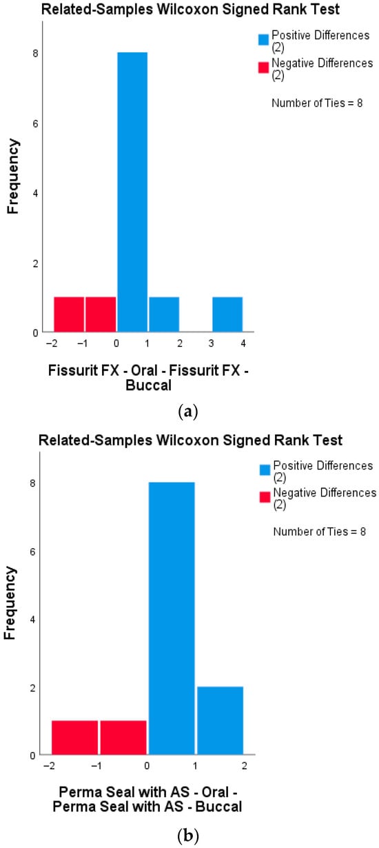 None of the tested materials showed significant differences in microleakage scores between buccal and oral surfaces. This suggests that surface orientation does not influence the sealing performance of the applied materials, regardless of the presence or absence of an adhesive system. Wilcoxon signed-rank tests were conducted for each sealant group to compare microleakage scores between buccal and oral surfaces of the same tooth sections. None of the groups showed statistically significant differences, indicating uniform sealing performance across surfaces. The distribution of paired differences between buccal and oral microleakage scores for each material group is presented in Figure 5a–c. All three groups demonstrated no statistically significant differences (Wilcoxon signed-rank test), supporting the visual impression of surface-independent sealant behavior.