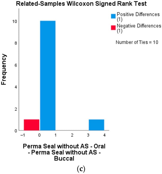 Distribution of differences between buccal and oral microleakage scores, analyzed using the Wilcoxon signed-rank test for each sealant group. (a) Fissurit FX group: Distribution of signed differences between buccal and oral surfaces. Most differences are zero or minimal, indicating consistent performance across surfaces. (b) Perma Seal with adhesive system: All matched pairs showed no or minimal difference in microleakage scores, confirming high uniformity of seal integrity. (c) Perma Seal without adhesive system: Although most differences remain low, several samples show discrepancies in microleakage between surfaces.
