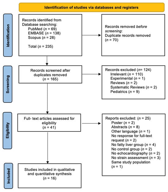 The initial search identified a total of 235 articles (PubMed: 69 articles, EMBASE: 138 articles, Scopus: 28 articles), as illustrated in Figure 1. Seventy studies were identified as duplicates and subsequently removed. Following this, 165 articles remained and were screened for eligibility based on inclusion and exclusion criteria through title and abstract review. The results of this screening were as follows: (1) 4 review articles (literature reviews: n = 2, systematic reviews: n = 2), (2) 9 pediatric studies, (3) 1 experimental study, and (4) 110 irrelevant studies. In total, 124 studies were excluded during this initial screening phase. The full texts of the remaining 41 articles were then thoroughly reviewed to assess eligibility for inclusion in the study. Of these, 25 were excluded for the following reasons: (1) 1 article was published in a language other than English, German, or Romanian (Chinese: 1 article) [24], (2) 8 articles were available only as abstracts, despite meeting the primary criteria [16,25,26,27,28,29,30,31], (3) 2 posters which met the primary criteria [32,33], (4) 2 articles missing a response to full-text requests [34,35], (5) 4 articles did not include a fatty liver group [36,37,38,39], (6) 2 articles where a healthy control group was absent [40,41], (7) 2 articles did not utilize echocardiography for cardiac assessment [5,42], (8) 3 articles used cardiac assessment methods other than strain [43,44,45], and (9) 1 article used the same population group as another study, already utilized for analysis [46]. Subsequently, a total of 41 articles were assessed for eligibility. Of these, 16 articles were deemed suitable for qualitative and quantitative synthesis [8,12,14,17,18,47,48,49,50,51,52,53,54,55,56,57].
