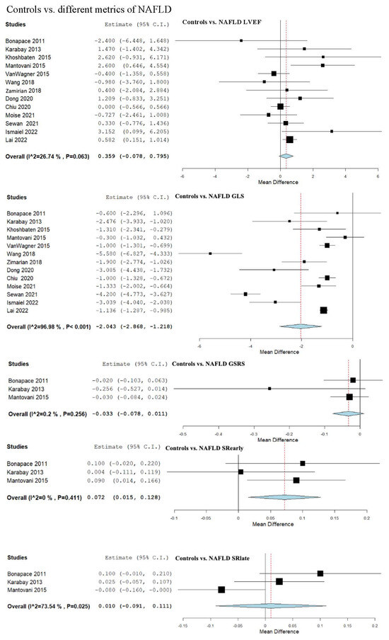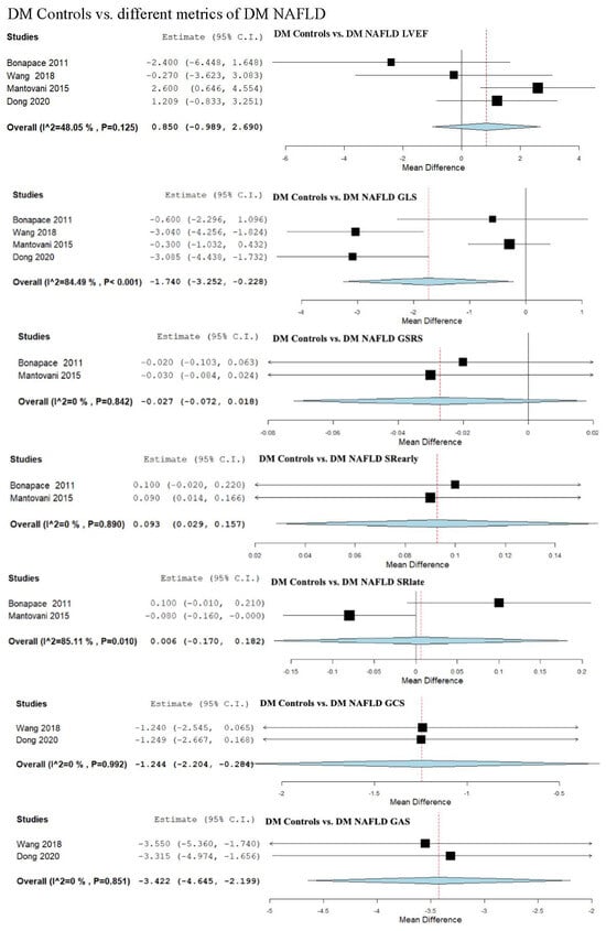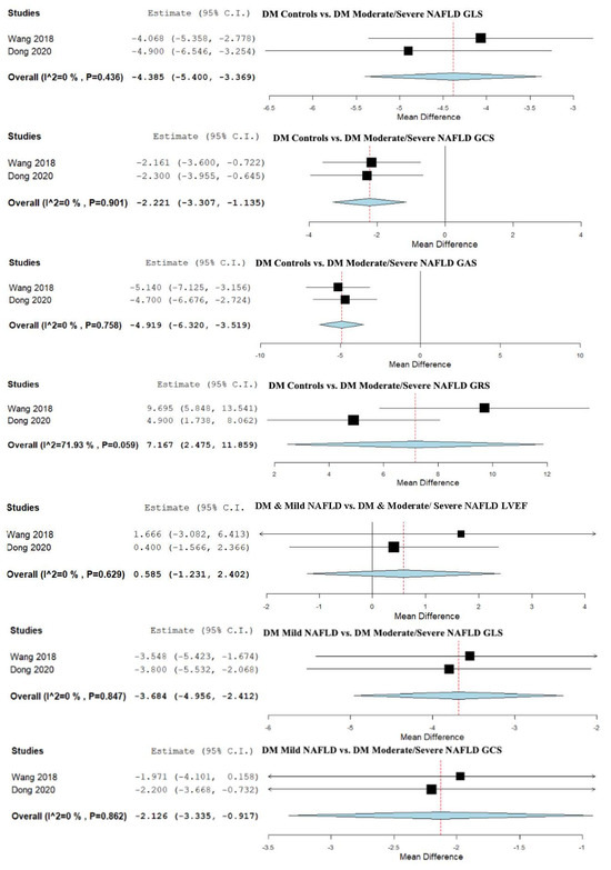 Studies evaluating myocardial strain parameters in DM-Controls vs. DM-NAFLD, DM-Controls vs. DM-Mild NAFLD, DM-Controls vs. DM-Moderate/Severe NAFLD, and DM-Mild NAFLD vs. DM-Moderate/Severe NAFLD [13,49,52,55]. NAFLD—non-alcoholic fatty liver disease; DM—diabetes mellitus; LVEF—left ventricular ejection fraction; GLS—global longitudinal strain; GSRS—global systolic strain rate; SRearly—strain rate in early phase of diastole; SRlate—strain rate in late phase of diastole; GCS—global circumferential strain; GAS—global area strain; GRS—global radial strain.