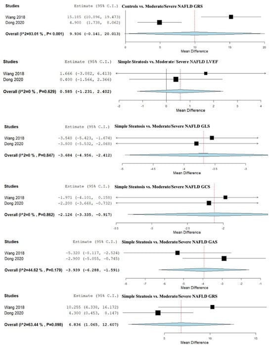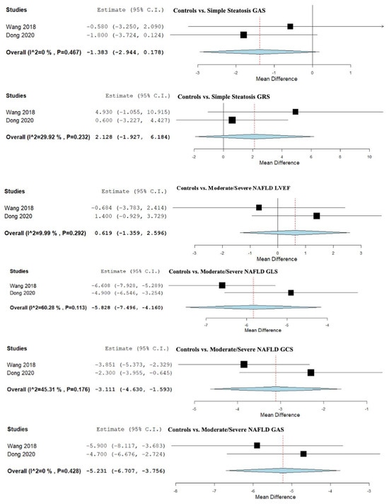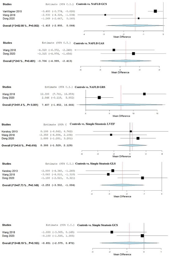 GLS was analyzed in three studies that compared control subjects to patients with simple steatosis [13,50,55], showing an overall MD of −2.253 (95% CI −3.502, −1.004). Moderate heterogeneity was reported with an I2 = 47.73% and p-value = 0.149.