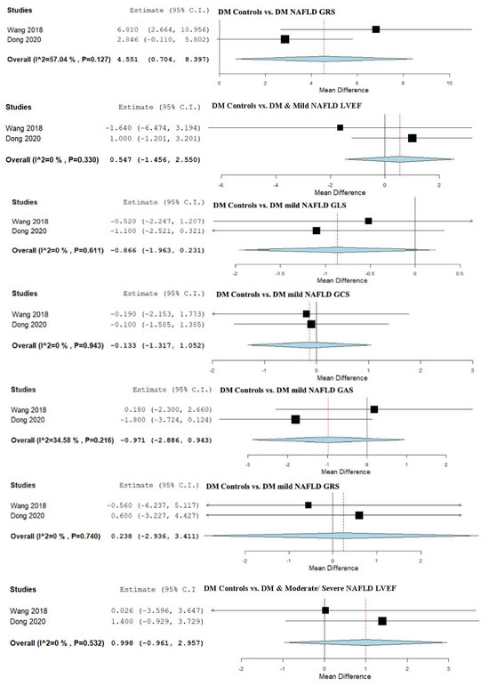 We evaluated the LVEF among two studies that compared a group with DM and mild NAFLD to a group with DM and moderate to severe NAFLD [13,55]. The analysis of studies evaluating the LVEF in these two groups revealed an overall MD of 0.585 (95% CI −1.231, 2.402). Unimportant heterogeneity was observed, with an I2 = 0% and a p-value = 0.629.