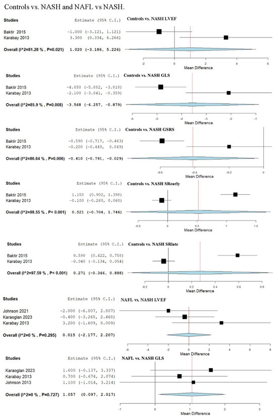 Studies evaluating myocardial strain parameters in Controls vs. NASH and NAFL vs. NASH [50,53,54,57]. NAFL—non-alcoholic fatty liver; NASH—non-alcoholic steatohepatitis. LVEF—left ventricular ejection fraction; GLS—global longitudinal strain; GSRS—global systolic strain rate; SRearly—strain rate in early phase of diastole; SRlate—strain rate in late phase of diastole.