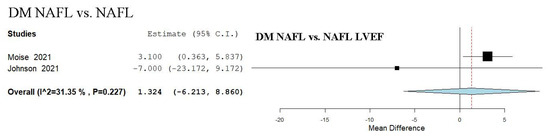 Study evaluating echocardiographic parameters including LVEF in DM NAFL vs. NAFL [47,54]. NAFL—non-alcoholic fatty liver; DM—diabetes mellitus; LVEF—left ventricular ejection fraction.