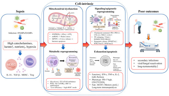 Integrated schematic of sepsis-induced CD8+ T cell dysfunction. Sepsis triggers systemic inflammation and metabolic stress, exposing CD8+ T cells to high levels of pathogen-associated molecular patterns (PAMPs) and damage-associated molecular patterns (DAMPs), catecholamines, hypoxia, lactate accumulation and nutrient deprivation. These insults, together with suppressive cues from myeloid-derived suppressor cells (MDSCs), regulatory T cells (Tregs) and immunosuppressive cytokines such as interleukin-10 (IL-10) and transforming growth factor-β (TGF-β), promote mitochondrial dysfunction characterized by impaired oxidative phosphorylation (OXPHOS), loss of mitochondrial membrane potential, reduced adenosine triphosphate (ATP) production and excessive generation of mitochondrial reactive oxygen species (mtROS). Mitochondrial insufficiency and redox stress act as upstream triggers of maladaptive metabolic reprogramming, including defective glycolysis, tricarboxylic acid (TCA) cycle and fatty acid oxidation (FAO), as well as inhibition of phosphatidylinositol 3-kinase (PI3K)–Akt–mammalian target of rapamycin (mTOR) signaling. These metabolic derangements feed into altered transcriptional and epigenetic programs, with downregulation of effector-associated transcription factors such as T-bet and upregulation of exhaustion-related factors including eomesodermin (EOMES), thymocyte selection-associated high-mobility-group box protein (TOX) and nuclear receptor subfamily 4 group A (NR4A) family members, accompanied by increased DNA methylation and repressive histone marks at effector gene loci. In parallel, persistent engagement of immune checkpoints, including programmed cell death protein 1 (PD-1) and its ligand programmed death-ligand 1 (PD-L1), cytotoxic T lymphocyte-associated protein 4 (CTLA-4), T-cell immunoglobulin and mucin-domain containing-3 (TIM-3) and lymphocyte activation gene-3 (LAG-3), further dampens T-cell receptor signaling and co-stimulatory pathways. Together, these cell-intrinsic and cell-extrinsic processes culminate in CD8+ T cell exhaustion and apoptosis, reflected by reduced cytokine production, diminished cytotoxic granule content, loss of proliferative capacity, contraction of the memory pool and increased susceptibility to secondary infections and late mortality.