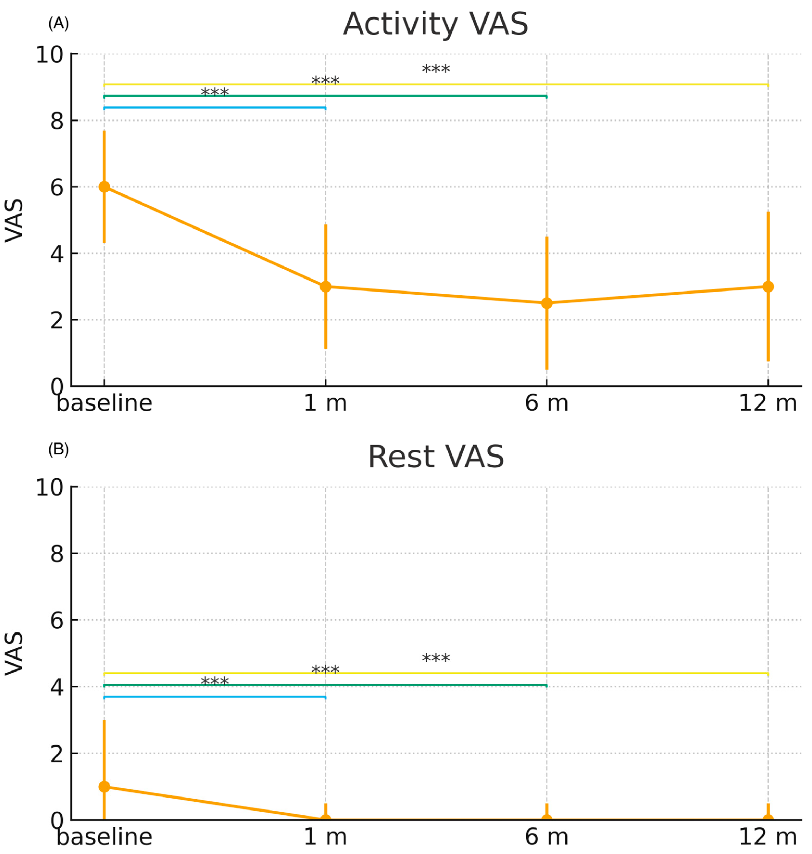 There were statistically significant differences in resting and activity-related pain, expressed through the VAS, between baseline values (at rest, median: 1, range: 0–9; in activity, median: 6, range: 1–10) and all other post-treatment evaluation times (1, 6, and 12 months). Notably, pain decreased in the first month after treatment (at rest, median: 0, range 0–7; in activity, median: 3, range: 0–10; p < 0.001), and this improvement was maintained after six (median: 2.5, range: 0–8; p < 0.001) and twelve months (median: 3, range: 0–9; p < 0.001). There were highly significant differences in activity-related pain, which was the most limiting for patients and had higher baseline values (Figure 2).