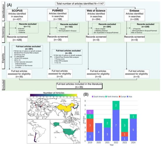 After excluding all articles that did not meet the criteria, only 35 were approved [,,,,,,,,,,,,,,,,,,,,,,,,,,,,,,,,,,], as described in the flowchart in Figure 1A. In Figure 1B, the distribution of the 35 included articles by geographical region and publication year is presented. China accounted for the highest proportion of studies (41.67%), followed by the United States with 25%. Most of the studies were published in 2022, with nine studies predominantly conducted in Asian countries.