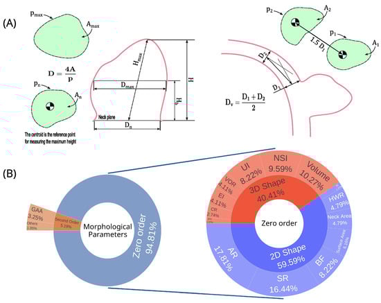 Aneurysm morphological parameters distribution and one-dimensional measurements. (A) Aneurysm one-dimensional parameters; (B) Percentual distribution of morphological parameters used in the papers analyzed in the systematic review. Abbreviations—A: cross-sectional; D: diameter; H: height; p: perimeter; aspect ratio; SR: size ratio; NSI: nonsphericity index; BF: bottleneck factor; UI: undulation index; HWR: height-to-width ratio; VOR: volume-to-ostium area ratio; EI: ellipticity index; GAA: area-averaged Gaussian curvature; CR: convexity ratio; IPR: isoperimetric ratio; BL: bulge location; GLN: L2-norm of Gaussian curvature; MAA: area-averaged mean curvature; MLN: L2-norm of mean curvature.