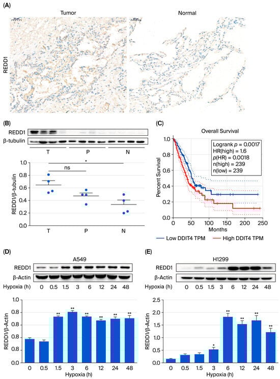 REDD1 is overexpressed in LUAD. (A) Immunohistochemistry staining images (200X) of REDD1 expression in four pairs of LUAD and normal tissues. (B) Western blot analyses of REDD1 protein level in samples of four matched LUAD (T), para-carcinoma tissues (P), and normal tissues (N); β-tubulin was used as the control. (C) Patients with high REDD1 expression exhibit a significantly reduced overall survival compared to those with low REDD1 expression. (Logrank p, p-value from log-rank test; HR, hazard ratio; p (HR), survival probability; n (high), number of high REDD1 expression; n (low), number of low REDD1 expression; TPM, transcripts per million). (D,E) Protein expression of REDD1 in A549 and H1299 cells at different durations of hypoxia. E, n = 4; F, n = 6. * p < 0.05; ** p < 0.01.
