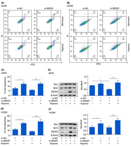 To confirm the effect of REDD1 on apoptosis, Annexin-V-FITC/PI staining was performed in A549 and H1299 cells. While hypoxia alone did not cause a statistically significant decrease in apoptosis, the trend toward decreased apoptosis under hypoxia was significantly reversed by REDD1 depletion (Figure 3A–D). Moreover, the Bax/Bcl2 ratio, an indicator of apoptosis, showed a decreasing trend after hypoxia in H1299 cells, although this change was not statistically significant. However, REDD1 silencing significantly upregulated the Bax/Bcl2 ratio under hypoxic conditions (Figure 3E,F).