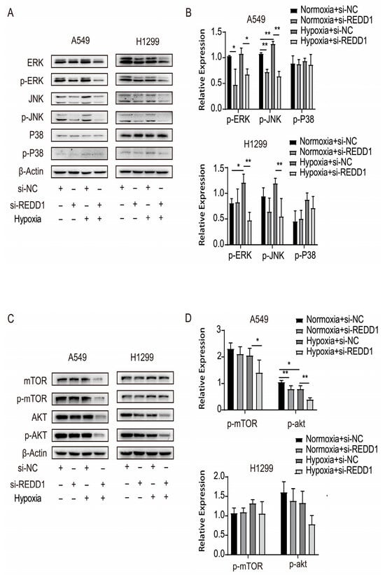 To explore the mechanism of REDD1 signaling involvement in LUAD, Western blots were utilized to assess the expression of relevant signaling proteins. We examined the MAPK family (ERK1/2, JNK, and p38 MAPK) and mTOR and Akt signaling pathways and revealed that phosphorylation of ERK1/2 and JNK was notably increased in A549 and H1299 under hypoxia and decreased after transfection with si-REDD1 (Figure 5A,B). On the contrary, phosphorylation of P38 did not increase in hypoxic A549 or H1299 cells (Figure 5A,B). Similarly, hypoxia did not increase phosphorylation of mTOR in either A549 or H1299 cells (Figure 5C,D).