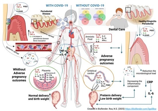 - Castaño-Suárez, L.; Paternina-Mejía, G.Y.; Vásquez-Olmos, L.D.; Rodríguez-Medina, C.; Botero, J.E. Linking Periodontitis to Adverse Pregnancy Outcomes: A Comprehensive Review and Meta-analysis. Curr. Oral Health Rep. 2024, 11, 125–137. [Google Scholar] [CrossRef]