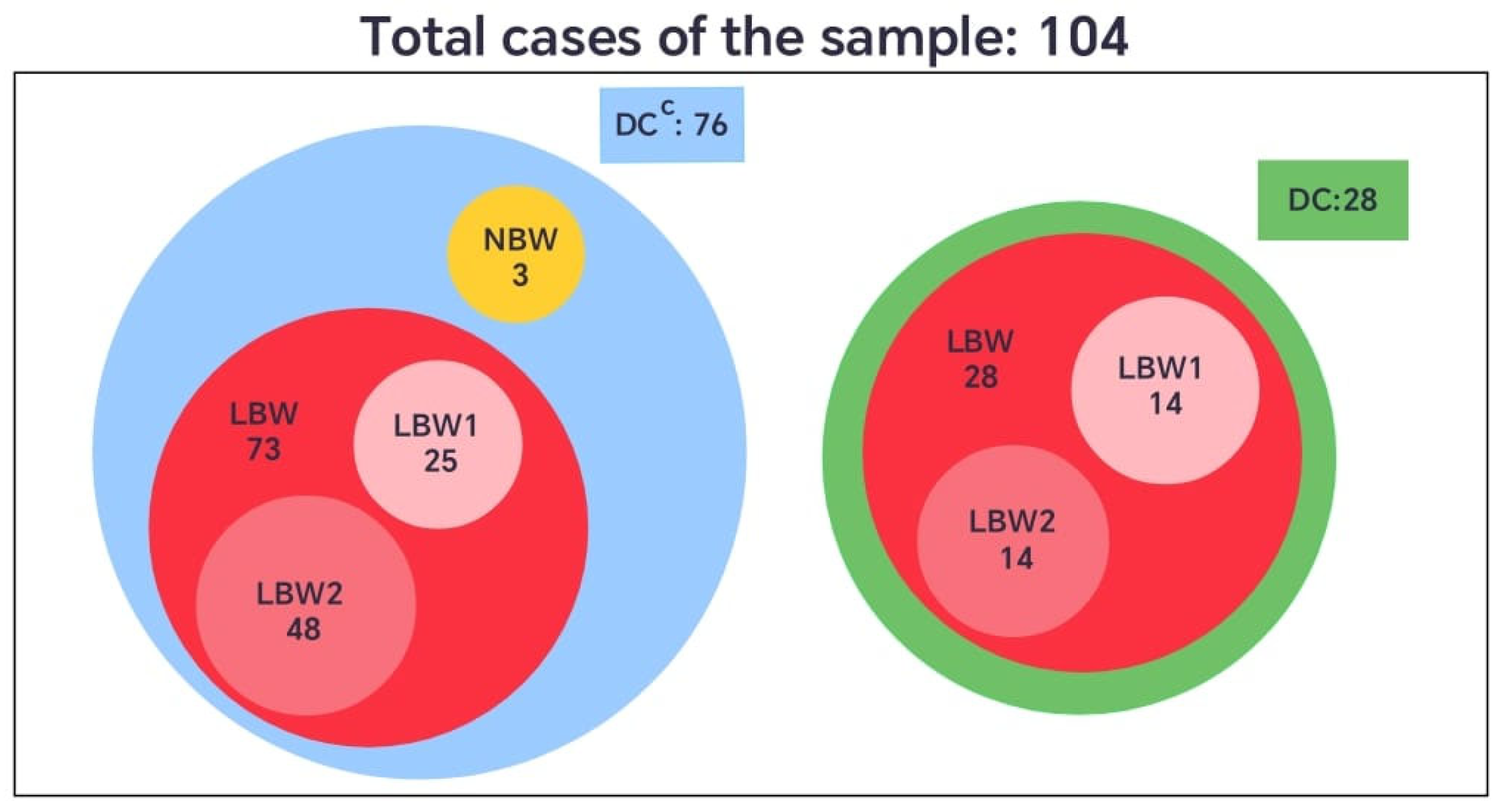 | P | The variable representing neonatal birth weight was analyzed using the LBW and NBW sets. Additionally, the LBW set was subdivided into smaller subsets (LBW1 and LBW2) to achieve a clearer understanding and more detailed analysis of this group. |