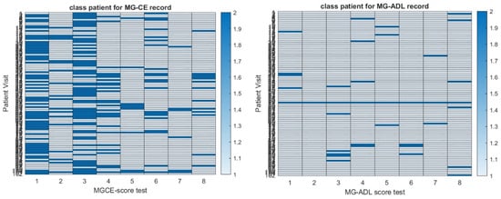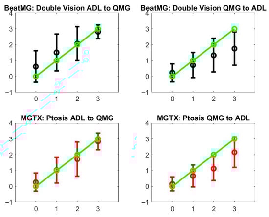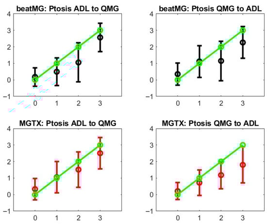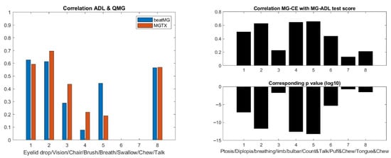 - One can map MG-ADL and QMG component by component when there is clear association, i.e., same muscle group, like ptosis, diplopia, leg strength, etc., that are scored for both MG-ADL and QMG. A similar analysis can be performed for MG-ADL and MG-CE with the ADAPT-MG data set. However, such maps would only be appropriate if the correlation were meaningful—see Figure 4. One can compare the individual test scores of MG-ADL and QMG only for ptosis, eyelid droop, and talking. On the other hand, one can compare the MG-ADL and MG-CE score only for ptosis, eyelid drop, limb, and bulbar strength. We discard the cheek puff test from the MG-CE data set because of its poor accuracy, as appreciated previously [,].