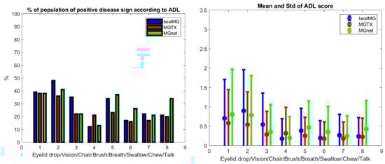 We assessed each clinical data set for the distribution of patient scores and the percentage of the population with positive symptoms using the MG-ADL for each individual score in the evaluation—see Figure 2.