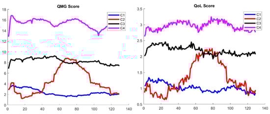 Classification of trajectories for the QMG (left panel) and QoL score (right panel) of the virtual population generated from the MGTX patients. The QoL score has been generated from the MG-ADL score using the stochastic map of Figure 7.
