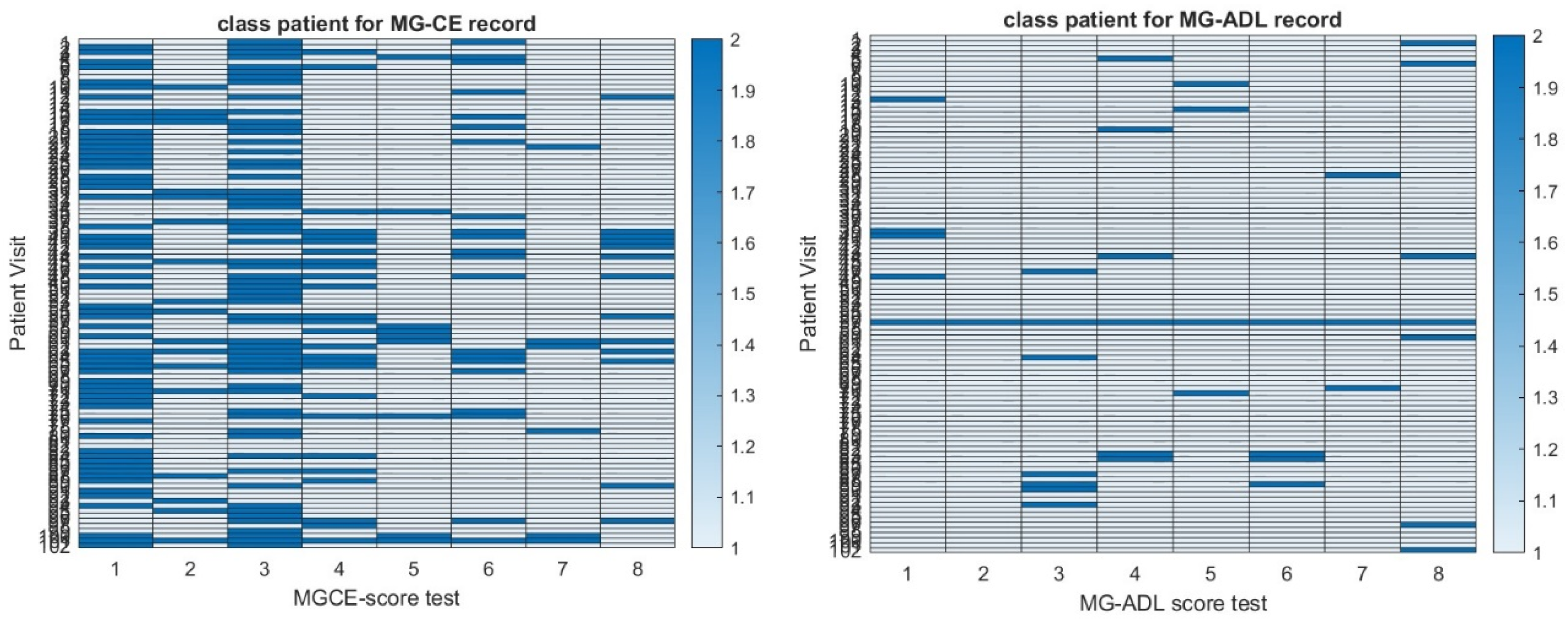 Figure 4. One can compare the individual test scores of MG-ADL and QMG only for ptosis, eyelid droop, and talking. On the other hand, one can compare the MG-ADL and MG-CE score only for ptosis, eyelid drop, limb, and bulbar strength. We discard the cheek puff test from the MG-CE data set because of its poor accuracy, as appreciated previously [