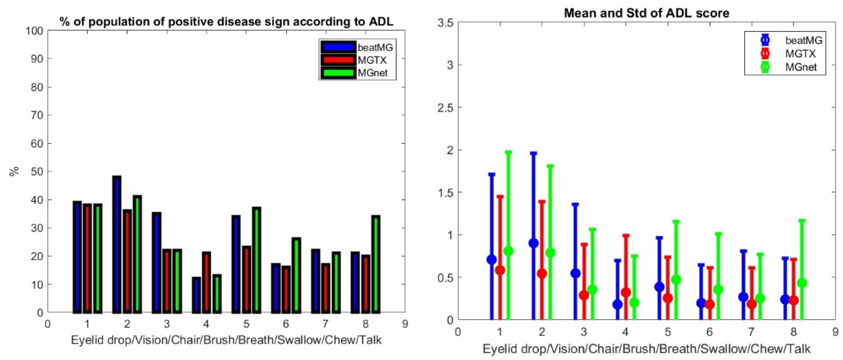 We assessed each clinical data set for the distribution of patient scores and the percentage of the population with positive symptoms using the MG-ADL for each individual score in the evaluation—see