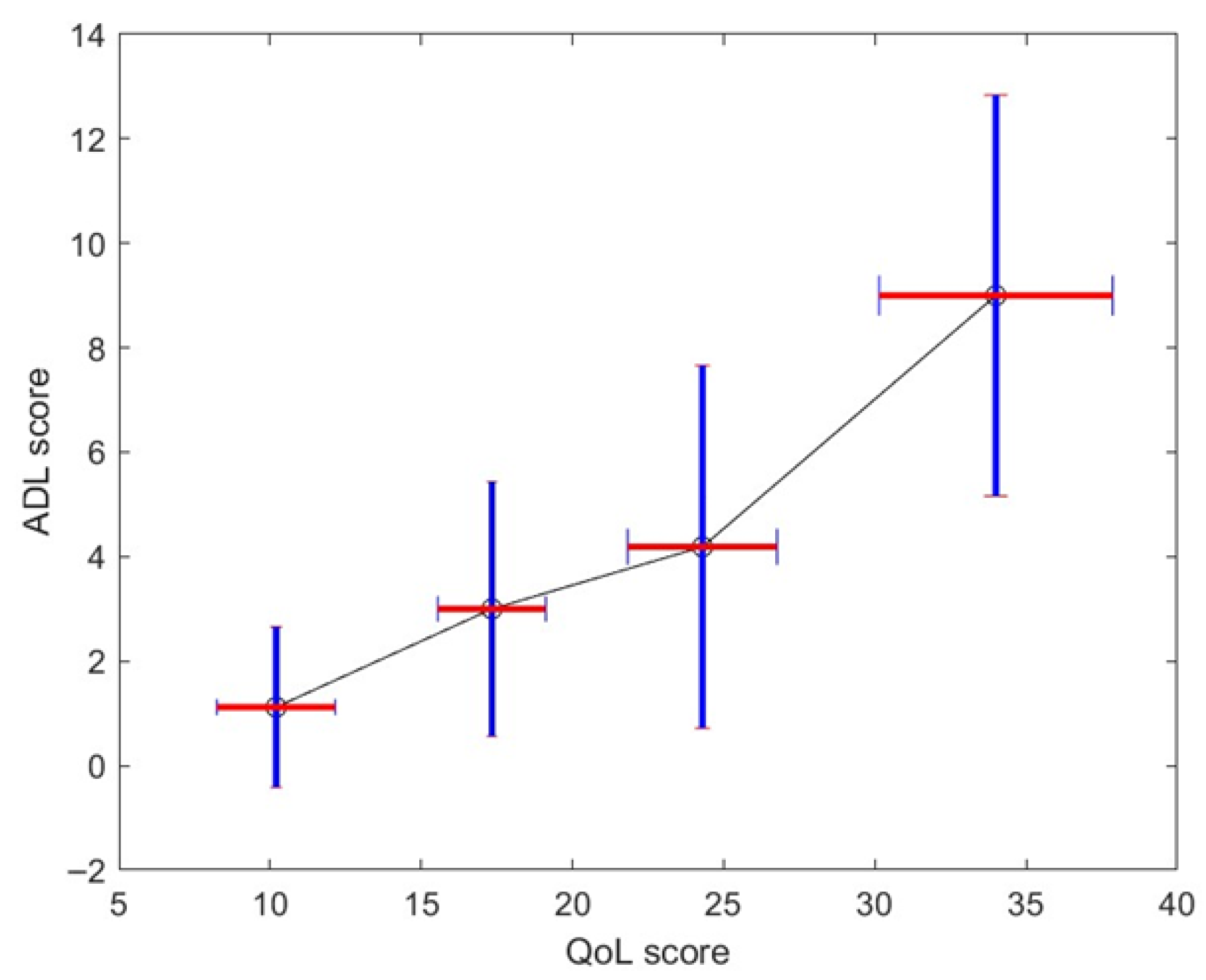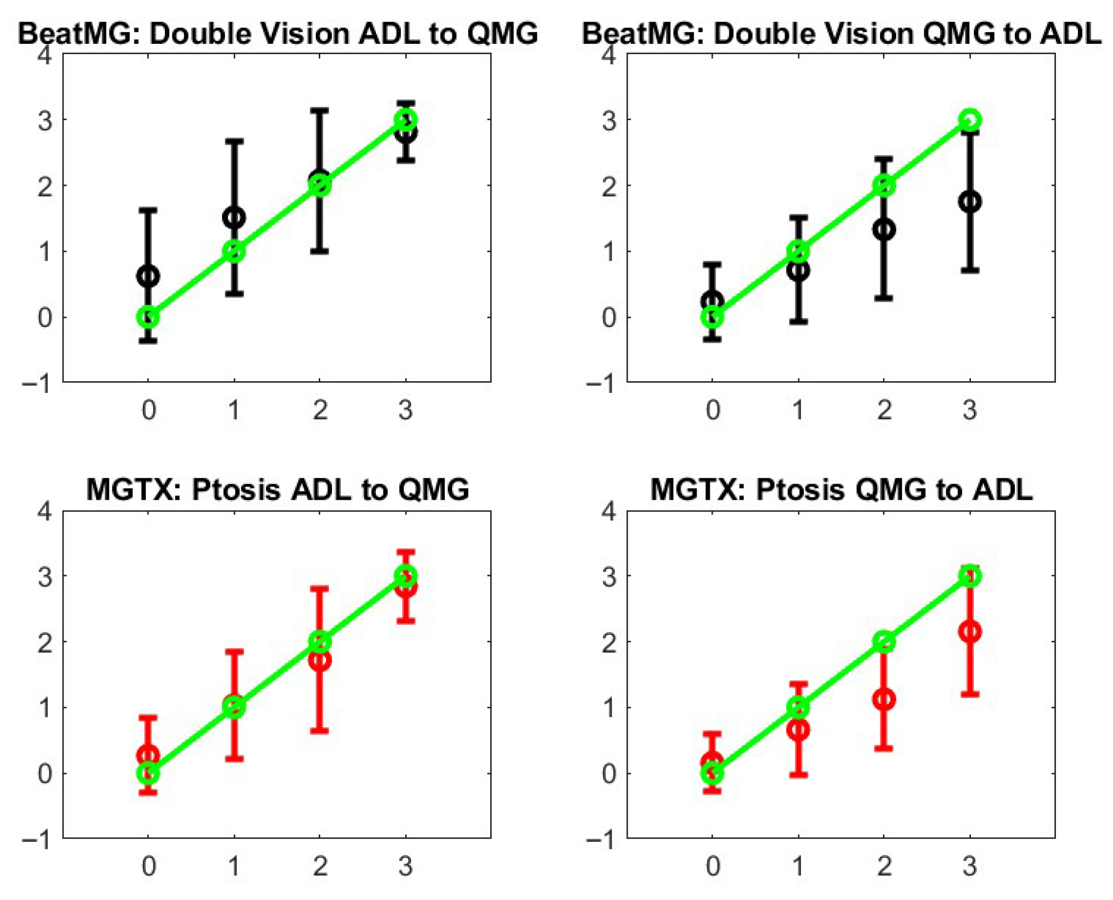 Figure 7. MG-ADL corresponds to patient report and is therefore appropriate to use for the QoL as opposed to the QMG, which is a single-time-point examiner-generated score. More precisely, assuming a normal distribution, we could generate from the mean and standard deviation on the QoL score corresponding to each level, 1 to 4, of the MG-ADL score.