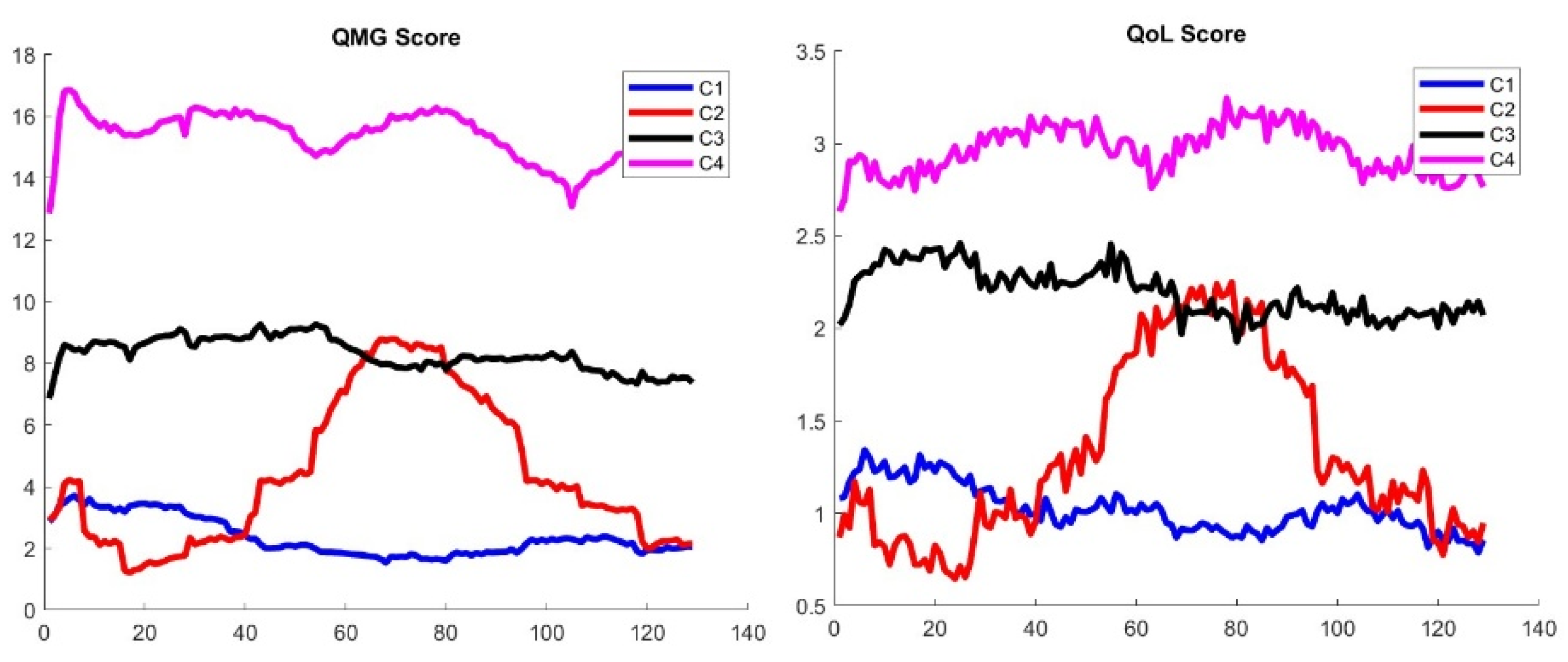 Figure 8 shows the main trajectories for the QMG and QoL scores. For completeness, the MG-ADL score trajectories are shown in