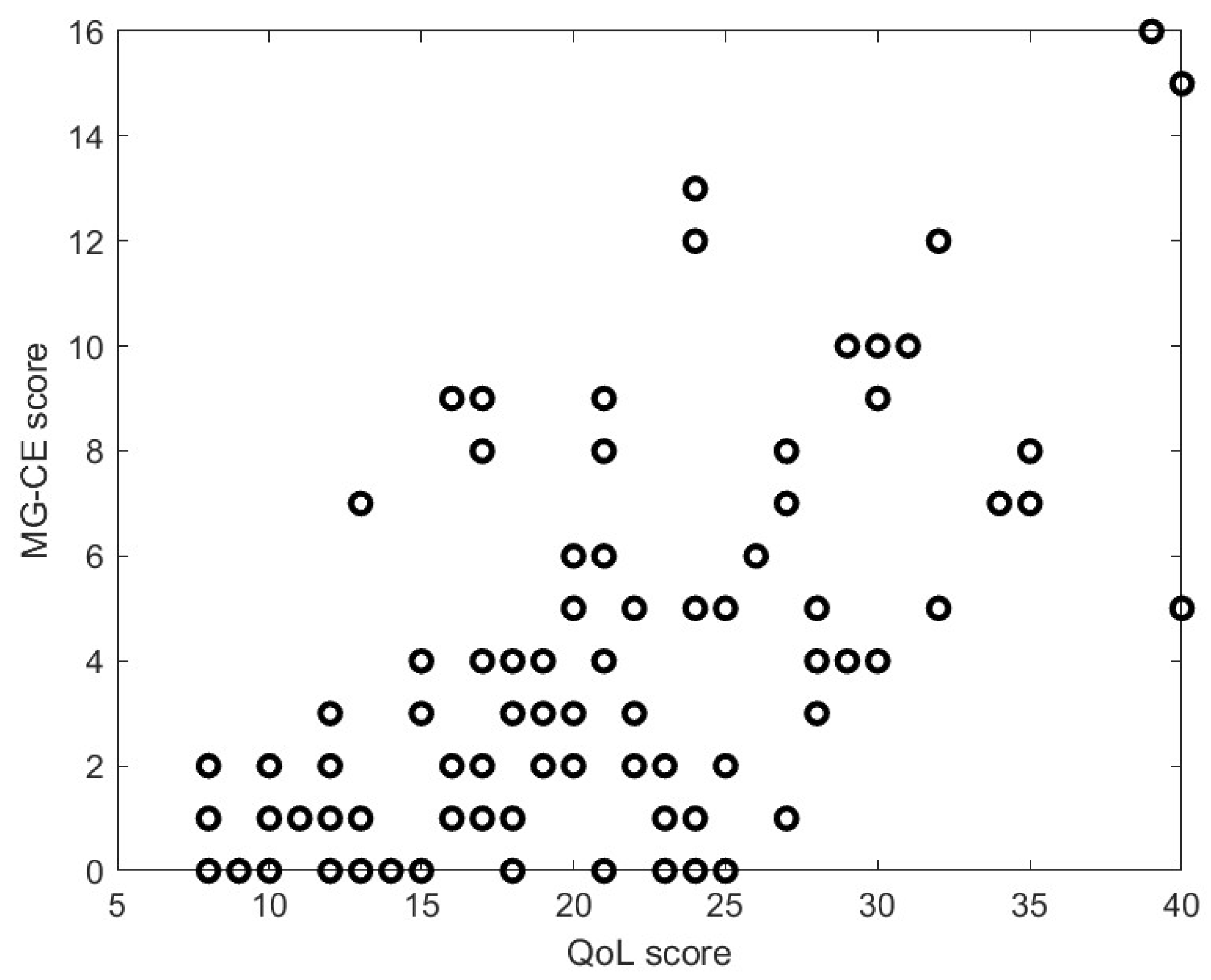 Figure 7. While there is a moderate correlation between the MG-ADL score and QoL score with ρ = 0.61 and