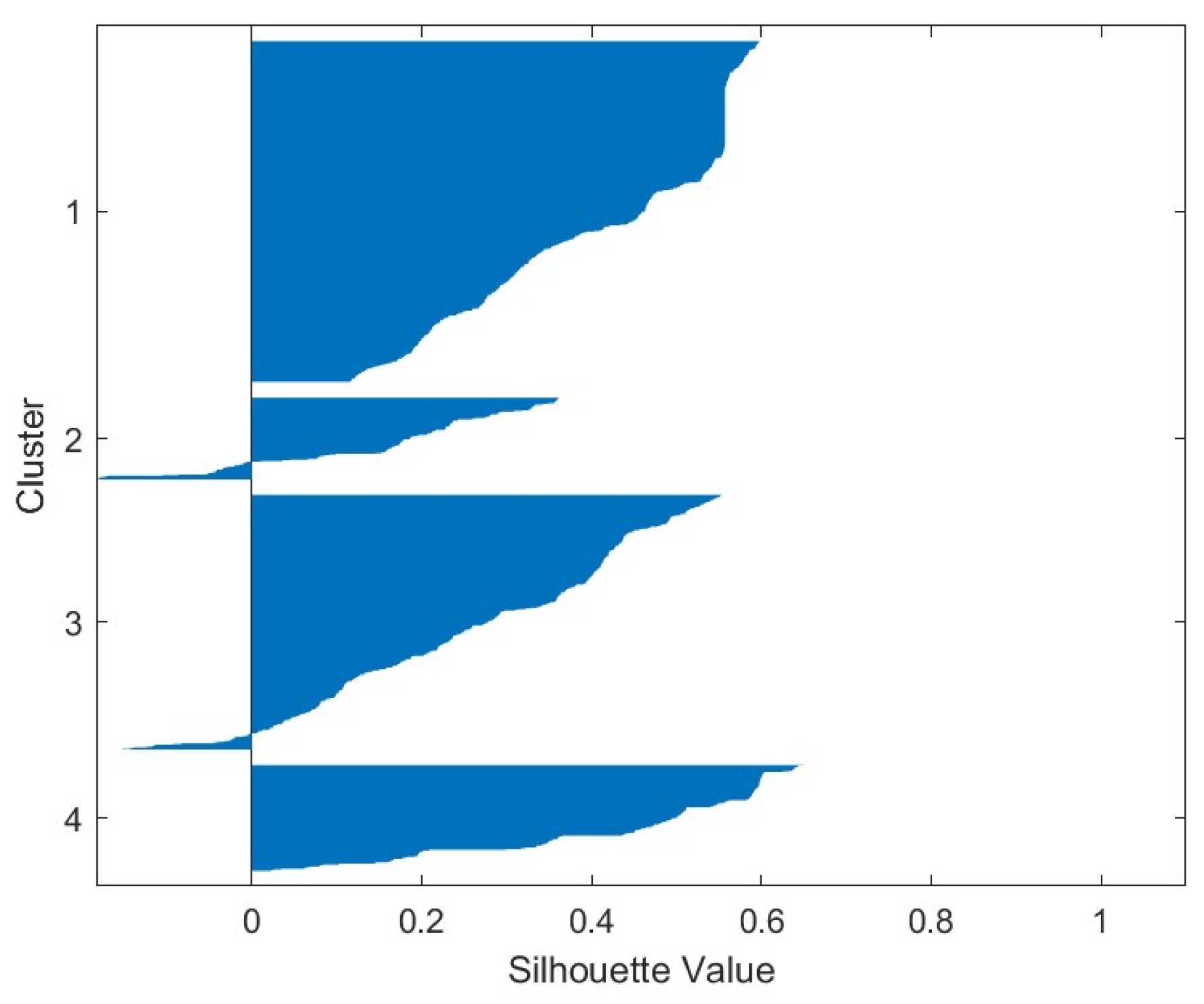 16], we compute the mean trajectories of these virtual patients with four clusters and keep a good separation between clusters as shown in the silhouette portrait as shown in