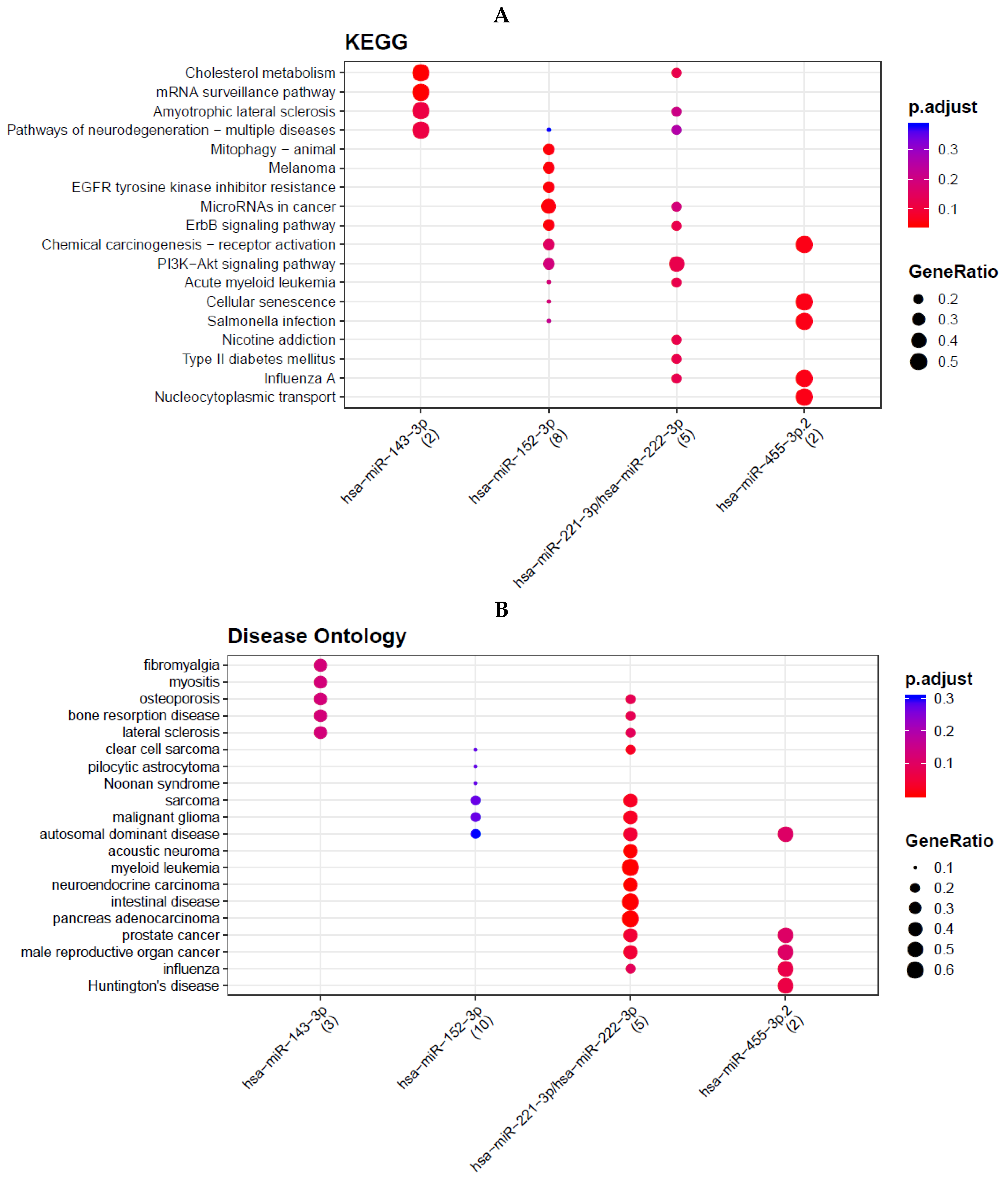 - Galardi, S.; Mercatelli, N.; Farace, M.G.; Ciafrè, S.A. The microRNA-221/222 cluster functions as a tumor suppressor and disease progression marker in trichotomy of prostate cancer. Br. J. Cancer 2015, 113, 1055–1065. [Google Scholar]