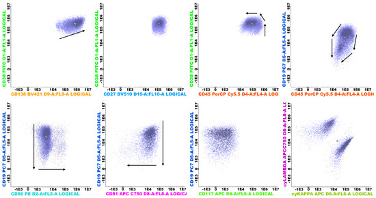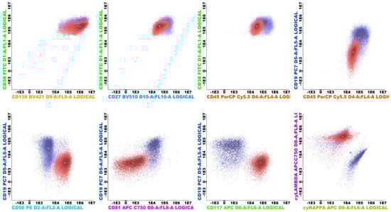 Flow cytometric analysis was performed on all patients. In order to minimize the costs and implementation time, we opted to use the already established panel for multiple myeloma that we use in our laboratory. The first bone marrow aspirate was assessed in all cases. Between 1 and 2 mL of bone marrow was collected into a single 5 mL K2-EDTA tube. Samples were processed within 24 h of aspiration in all cases. Pre-analytical procedures followed the EuroFlow protocol: the Multiple Myeloma Minimal Residual Disease(MM MRD KIT) (Cytognos S.L., Salamanca, Spain; BD Biosciences, San Jose, CA, USA, REF: CYT-MM-MRD8) was used to stain all samples (CD38 FITC multiepitope, CD56 PE clone C5.9, CD45 PerCP-Cyanine5.5 clone EO1, CD19 PE-Cyanine7 clone SA287, CD117 APC clone 104D2, CD81 clone APC-C750, CD138 BV421 clone MI15, CD27 BV510 clone O323, cyIgKappa APC and cyIgLambda APC-C750). The number of events interrogated exceeded 5 × 106 per sample. A bulk-lysis protocol was applied to maximize plasma cell recovery. Data were acquired on two 13-color instruments: BD FACSLyric (BD Biosciences, San Jose, CA, USA) and DxFLEX (Beckman Coulter, Brea, CA, USA). FCS 3.0 files were analyzed individually using Infinicyt software version 2.0.6 (Cytognos S.L., Salamanca, Spain). Automated analysis using the Infinicyt MM MRD database was not employed; files were reviewed manually. The primary endpoints were (i) clonality demonstrated by cytoplasmic κ or λ Light-chain restriction and (ii) pathology-related immunophenotypic abnormalities (CD56 overexpression; underexpression of CD27, CD81, and CD45; CD117 positivity; and under-/overexpression of CD138 and CD38) in plasma cells (Figure 1 and Figure 2) []. Dead cells and debris were excluded from analysis by employing different analytical methods: Doublet exclusion by both Side Scatter Area versus Side Scatter Height and Forward Scatter Area versus Forward Scatter Height, and Debris (small events with low internal complexity) from Side Scatter Area versus Forward Scatter Area.