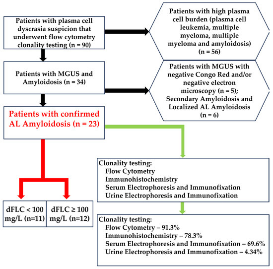 Selection methods for our cohort. In the hexagons are represented the exclusion criteria. The red arrows represent the dFLC grouping. The green arrow represents the clonality tests. From the total of 90 patients with plasma cell dyscrasia suspicion that also underwent flow cytometric testing, 56 were excluded because of the very high plasma cell burden, 5 were excluded because the underlying pathology was demonstrated to be MGUS with negative amyloid deposition by Congo Red staining and/or electron microscopy, and another 6 had either localized or secondary amyloidosis.