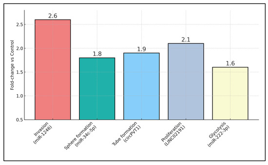 Quantitative phenotypic readouts are summarised in Figure 1, which displays fold-changes (relative to control) for invasion, endothelial tube formation, glycolytic ECAR, and proliferation across cargo types. Bars show fold-change vs. matched control: invasion (Transwell), endothelial tube length (HUVEC), extracellular acidification rate (ECAR, glycolysis proxy), and cell proliferation. Labels indicate primary cargo (e.g., miR-1246, circPVT1, LINC02191). Where available, reversal with inhibitors/mimics is annotated. Error bars were omitted where studies reported point estimates only. ECAR = extracellular acidification rate; HUVEC = human umbilical-vein endothelial cell.