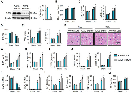 GDF6 knockdown aggravates pressure overload-induced cardiac hypertrophy and dysfunction. (A) GDF6 protein levels in murine hearts with AAV9-shCtrl or AAV9-shGdf6 injection. (B) Heart rate in sham- or TAC-operated mice with AAV9-shCtrl or AAV9-shGdf6 injection. (C,D) Left ventricle internal diameter at end-diastole (LVEDd), left ventricle internal diameter at end-systole (LVEDs), and fractional shortening (FS). (E) Interventricular septal thickness at end-diastole (IVSd) and interventricular septal thickness at end-systole (IVSs). (F,G) Hematoxylin–eosin staining of murine hearts and quantification of cross-sectional area (CSA). (H,I) Quantification of heart weight/tibia length (HW/TL) and lung weight/tibia length (LW/TL) ratios. (J,K) Nppa, Nppb, Myh7, and Myh6 mRNA levels in murine hearts. (L) The levels of inflammatory cytokines in the myocardium. (M) BP levels. n = 6 per group. * p < 0.05 versus matched sham mice receiving AAV9-shCtrl injection, # p < 0.05 versus matched TAC mice receiving AAV9-shCtrl injection. One-way ANOVA followed by Tukey post hoc test was applied. In (A), Student’s two-tailed t-test was performed.