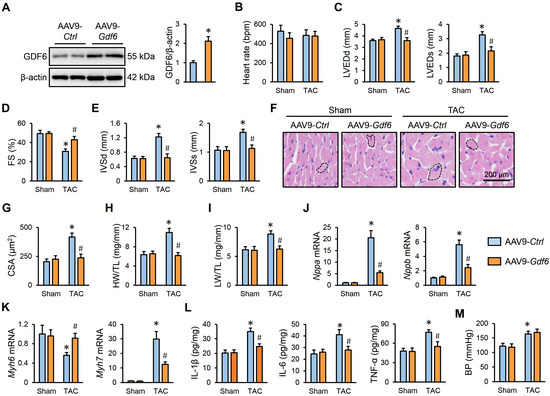 GDF6 overexpression attenuates pressure overload-induced cardiac hypertrophy and dysfunction. (A) GDF6 protein levels in murine hearts injected with AAV9-Ctrl or AAV9-Gdf6. (B) Heart rate in sham- or TAC-operated mice with AAV9-Ctrl or AAV9-Gdf6 injection. (C,D) LVEDd, LVEDs, and FS. (E) IVSd and IVSs. (F,G) Hematoxylin–eosin staining of murine hearts and quantification of CSA. (H,I) Quantification of HW/TL and LW/TL. (J,K) Nppa, Nppb, Myh7, and Myh6 mRNA levels in murine hearts. (L) The levels of inflammatory cytokines in the myocardium. (M) BP levels. n = 6 per group. * p < 0.05 versus matched sham mice receiving AAV9-Ctrl injection, # p < 0.05 versus matched TAC mice receiving AAV9-Ctrl injection. One-way ANOVA followed by Tukey post hoc test was applied. In (A), Student’s two-tailed t-test was performed.