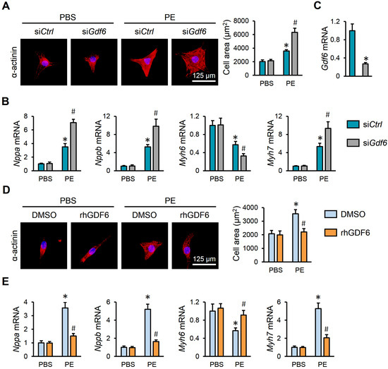 GDF6 prevents PE-induced hypertrophic growth of NRVMs. (A) Immunofluorescence staining of α-actinin and quantification of cell area in NRVMs with or without GDF6 knockdown. (B) Nppa, Nppb, Myh7, and Myh6 mRNA levels in NRVMs with or without GDF6 knockdown. (C) GDF6 mRNA levels in NRVMs with or without GDF6 knockdown. (D) Immunofluorescence staining of α-actinin and quantification of cell area in NRVMs with or without recombinant human GDF6 (rhGDF6) treatment. (E) Nppa, Nppb, Myh7, and Myh6 mRNA levels in NRVMs with or without rhGDF6 treatment. n = 6 per group. * p < 0.05 versus matched PBS NRVMs receiving siCtrl or dimethyl sulfoxide (DMSO) treatment, # p < 0.05 versus matched PE NRVMs receiving siCtrl or DMSO treatment. One-way ANOVA followed by Tukey post hoc test was applied. In (C), Student’s two-tailed t-test was performed.