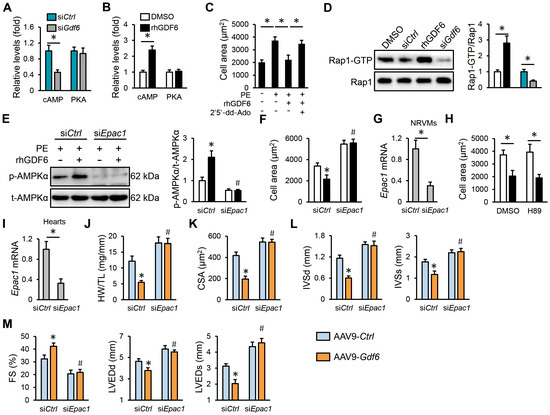 Finally, we explored the precise mechanism through which GDF6 activated AMPKα. The cAMP is a critical secondary messenger in transducing extracellular stimuli to intracellular signaling network, and acts as a classic upstream activator of AMPKα in a PKA-dependent manner [47]. As shown in Figure 6A,B, GDF6 knockdown decreased, while rhGDF6 treatment increased, intracellular cAMP levels in PE-stimulated NRVMs, without affecting PKA activities. However, the protective effects of rhGDF6 against PE-induced cardiomyocyte hypertrophy were prevented by 2′5′-dd-Ado, an AC inhibitor that reduces cAMP generation (Figure 6C). In addition to PKA, Epac1, the other downstream effector of cAMP, is a well-known activator of AMPKα [48,49]. We found that Epac1 was activated by rhGDF6, but inhibited by GDF6 knockdown, as evidenced by the downstream Rap1-GTP levels (Figure 6D). As shown in Figure 6E, Epac1 silence completely abolished rhGDF6-mediated AMPKα activation under PE stimulation. As expected, the anti-hypertrophic effects of rhGDF6 were also blocked in PE-treated NRVMs with Epac1 silence (Figure 6F,G). As expected, PKA inhibition did not affect the anti-hypertrophic effects of rhGDF6 in vitro (Figure 6H). To further validate the role of Epac in vivo, TAC mice were delivered with chemically modified siEpac1 using a Nanoparticle In Vivo Transfection Reagent from 2 weeks after TAC surgery, and the efficiency was validated by quantitative real-time PCR (Figure 6I). Consistent with the in vitro findings, Epac1 silence also blocked the anti-hypertrophic effects of GDF6 in mice, as evidenced by an increased HW/TL, CSA, IVSd, and IVSs (Figure 6J–L). Meanwhile, the improved cardiac dilation and dysfunction in GDF6-overexpressed hypertrophic hearts were also abolished by Epac1 silence (Figure 6M). Overall, our results reveal that GDF6 activates AMPKα through the cAMP/Epac1 pathway.