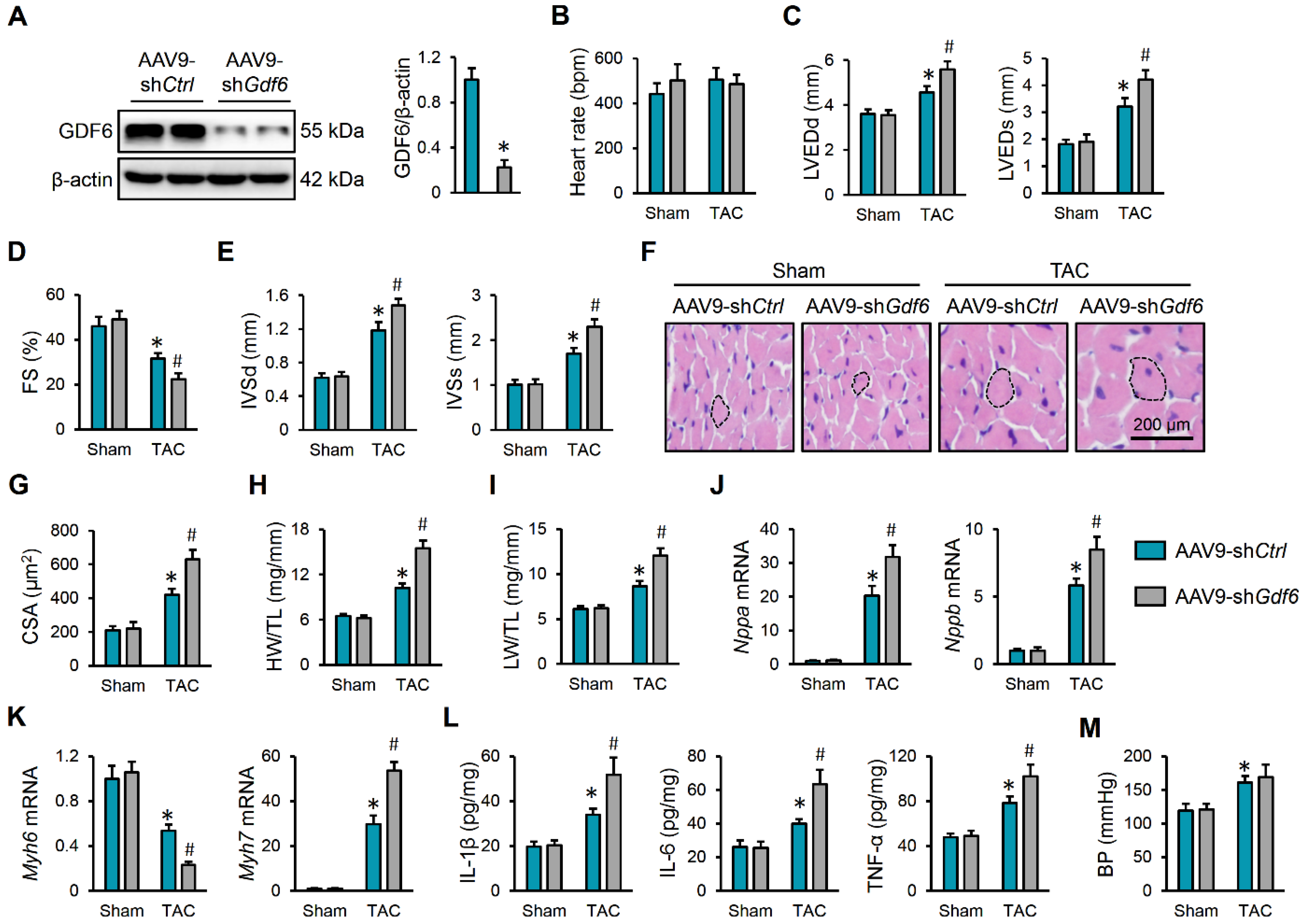 3.2. GDF6 Knockdown Aggravates Pressure Overload-Induced Cardiac Hypertrophy, Inflammation and Dysfunction