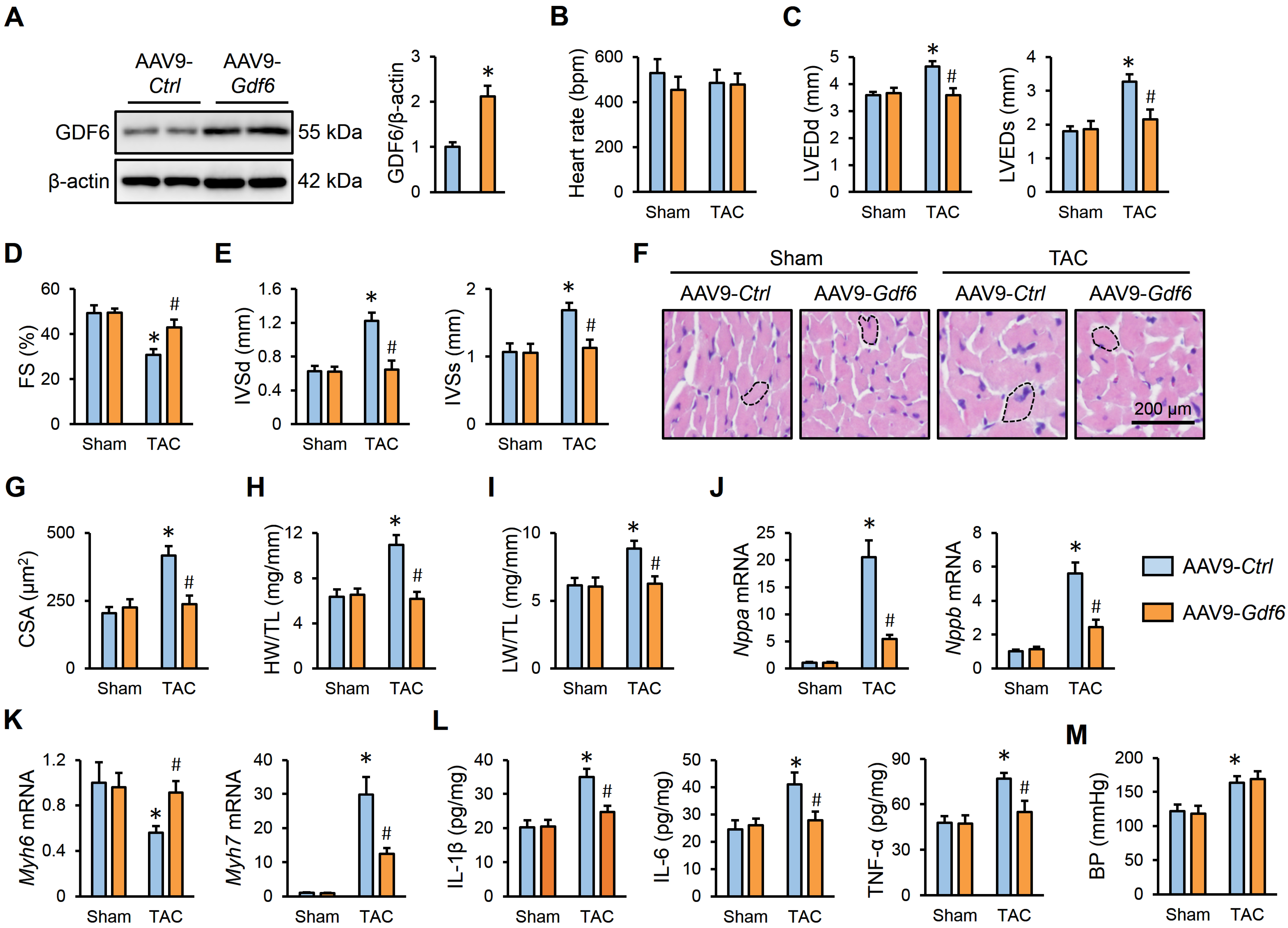 3.3. GDF6 Overexpression Attenuates Pressure Overload-Induced Cardiac Hypertrophy, Inflammation and Dysfunction