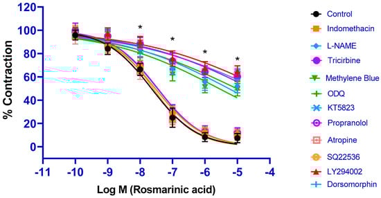 Log concentration–response curves for the vasorelaxant effects of rosmarinic acid (10−10–10−5 M) in the absence or presence of indomethacin (10 µM), L-NAME (100 µM), tricirbine (10 μM), methylene blue (10 μM), ODQ (10 μM), KT5823 (1 μM), propranolol (1 μM), atropine (1 μM), SQ22536 (50 μM), LY294002 (10 μM), and dorsomorphine (1 μM) in endothelium-intact aortic rings in comparison to control. Data shown are the mean ± SD (n = 8). * p < 0.001 vs. the control group. (2-way ANOVA followed by a Bonferroni post hoc test).
