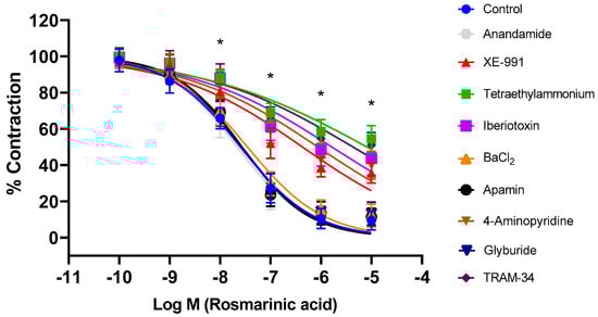 Log concentration–response curves for the vasorelaxant effects of rosmarinic acid (10−10–10−5 M) in the absence or presence of tetraethylammonium (nonselective K+ channel blocker; 1 mM), iberiotoxin (BKCa channel blocker; 10 nM), TRAM-34 (IKCa channel blocker; 1 µM), 4-aminopyridine (Kv channel blocker; 1 mM), XE-991 (Kv7.1–7.5 channel blocker; 1 µM), glyburide (KATP channel blocker; 10 µM), apamin (SKCa channel blocker; 100 nM), anandamide (K2P channel blocker; 10 µM), and BaCl2 (Kir channel blocker; 10 µM) in endothelium-intact aortic rings in comparison to control. Data shown are the mean ± SD (n = 8). * p < 0.001 vs. the control group. (2-way ANOVA followed by a Bonferroni post hoc test).