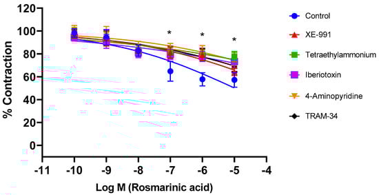 Log concentration–response curves for the vasorelaxant effects of rosmarinic acid (10−10–10−5 M) in the absence or presence of tetraethylammonium (nonselective K+ channel blocker; 1 mM), iberiotoxin (BKCa channel blocker; 10 nM), TRAM-34 (IKCa channel blocker; 1 µM), 4-aminopyridine (Kv channel blocker; 1 mM), and XE-991 (Kv7.1–7.5 channel blocker; 1 µM) in endothelium-denuded aortic rings in comparison to control. Data shown are the mean ± SD (n = 6). * p < 0.001 vs. the control group. (2-way ANOVA followed by a Bonferroni post hoc test).