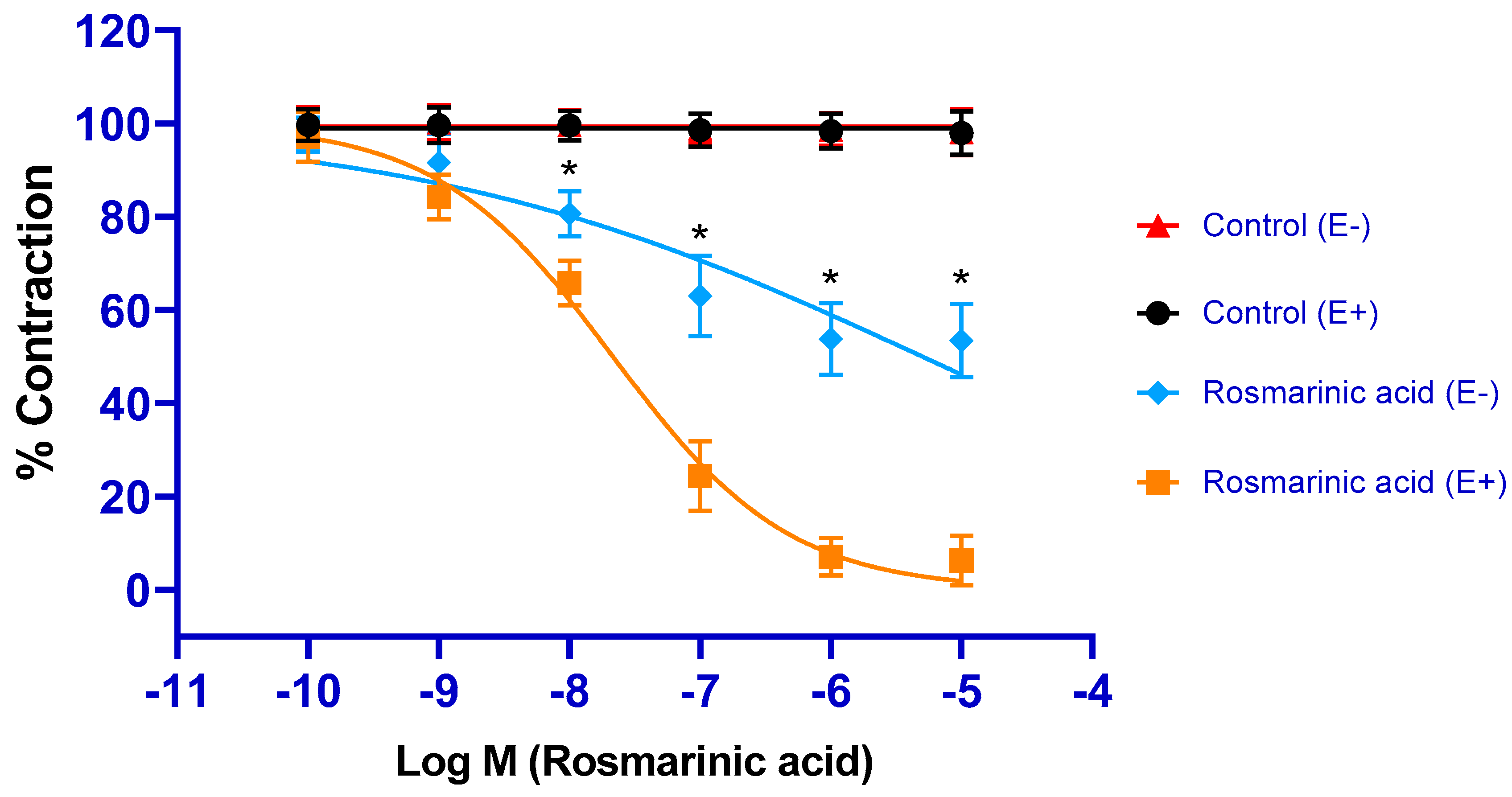 | Rosmarinic acid (E-) | Vasorelaxant effect | 10−10–10−5 M | 1450.75 ± 45.44 | 5.26 ± 0.18 | 46.57 ± 7.88 | 8 | - |